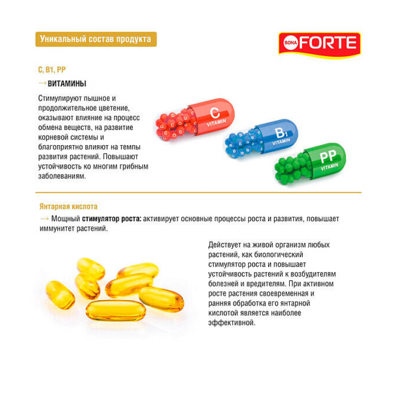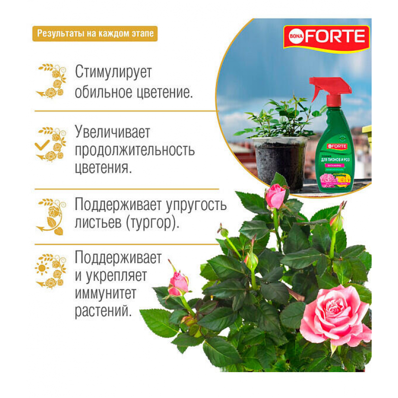 Тоник BONA FORTE для роз, пионов и цветущих растений — это специальный спрей для ухода за листьями и цветами, который помогает поддерживать здоровье и красоту ваших растений. В состав входят витамины, янтарная кислота и неионогенное ПАВ, которые стимулируют обильное и продолжительное цветение, укрепляют иммунитет растений и уменьшают оседание пыли на поверхности. Средство легко наносится благодаря удобной форме спрея, обеспечивая равномерное покрытие. Объем флакона — 500 мл, что делает его экономичным в использовании. Произведено в России компанией АО «Русинхим». Перед покупкой рекомендуется уточнять актуальные характеристики и наличие в конкретном магазине.
