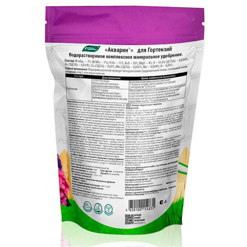 Удобрение Акварин 1 для Гортензий — это водорастворимое минеральное удобрение, специально разработанное для подкормки гортензий и других цветочно-декоративных культур на протяжении всего периода вегетации. Сбалансированный состав включает макроэлементы NPK (7% азота, 11% фосфора, 30% калия), магний (4%), серу (3%) и комплекс микроэлементов (железо, цинк, марганец, медь, бор, молибден), что обеспечивает полноценное питание растений, способствует яркому и продолжительному цветению, укреплению корневой системы и повышению устойчивости к стрессам. Удобрение легко растворяется в воде и может применяться как для корневой подкормки (полив), так и для внекорневой (опрыскивание). При совместном использовании со средствами защиты растений помогает смягчить стрессовое воздействие химикатов. Производится в России на Буйском химическом заводе, форма выпуска — порошок в упаковке 0,5 кг.