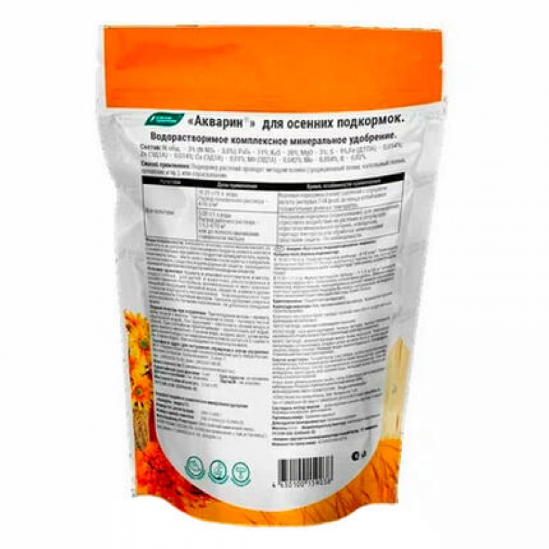 Удобрение Акварин 15 — это водорастворимое комплексное минеральное удобрение, специально разработанное для осенних подкормок многолетних растений. Его сбалансированный состав с пониженным содержанием азота и повышенным — фосфора и калия, обогащённый магнием, серой и комплексом микроэлементов (железо, цинк, марганец, медь, бор, молибден), способствует эффективной подготовке растений к зиме. Удобрение повышает морозостойкость деревьев, кустарников, многолетних декоративных культур и озимых посевов. Благодаря кислой реакции (рН) оно легко и полностью растворяется даже в холодной воде, что обеспечивает быстрое и полноценное усвоение питательных веществ как через корневую систему, так и при листовой подкормке. Форма выпуска — удобный в дозировке порошок. Произведено в России.