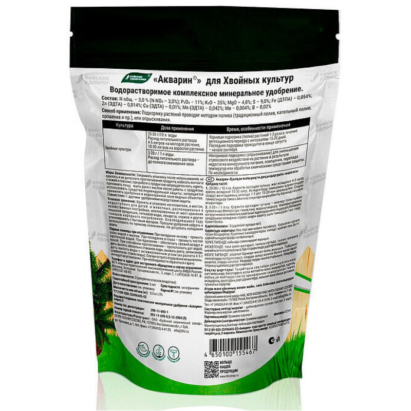 Удобрение Акварин 3 для Хвойных — это водорастворимое минеральное удобрение, специально разработанное для полноценного питания хвойных культур. Сбалансированный состав включает основные макроэлементы (NPK 3:11:35), магний, серу и комплекс важнейших микроэлементов: железо, цинк, марганец, медь, бор и молибден. Удобрение предназначено для корневых подкормок (полив) и внекорневых (опрыскивание) в течение всего вегетационного периода. Оно способствует интенсивному росту, укреплению иммунитета растений, сохранению насыщенной окраски хвои и повышению устойчивости к неблагоприятным факторам. При совместном применении со средствами защиты растений помогает смягчить стрессовое воздействие химикатов. Форма выпуска — порошок, легко растворяющийся в воде. Производитель — ОАО «Буйский химический завод», Россия.