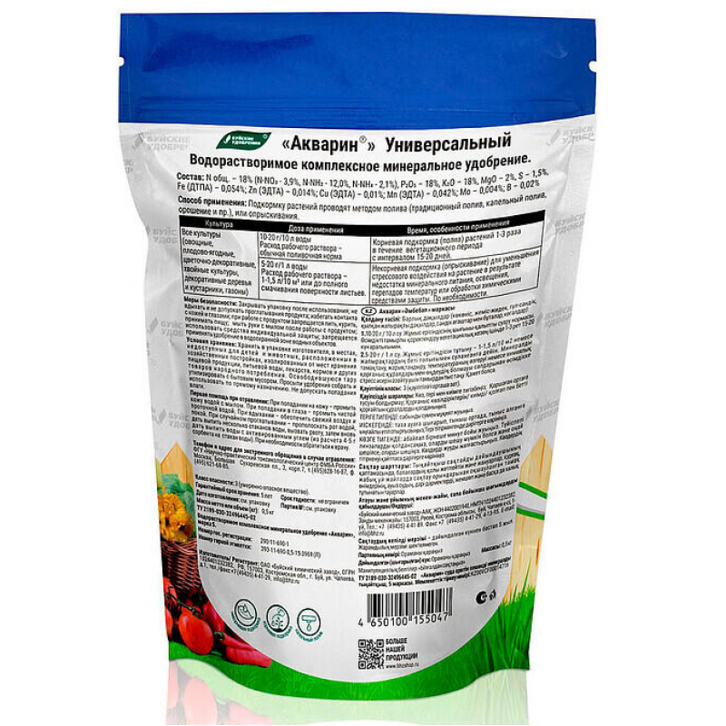 Удобрение Акварин 5 Универсальное — это водорастворимое минеральное удобрение, предназначенное для подкормки всех видов растений, включая цветочно-декоративные культуры. Сбалансированный состав NPK 18:18:18 обеспечивает равномерное питание азотом, фосфором и калием на всех этапах вегетации. Дополнительно обогащено магнием, серой и комплексом микроэлементов (железо, цинк, марганец, медь, бор, молибден), что способствует полноценному развитию, укреплению иммунитета и яркому цветению. Удобрение легко растворяется в воде и подходит для корневой подкормки поливом или внекорневой — опрыскиванием. При совместном применении со средствами защиты растений помогает снизить стрессовое воздействие химикатов. Произведено в России на Буйском химическом заводе. Форма выпуска — порошок в упаковке 0,5 кг.