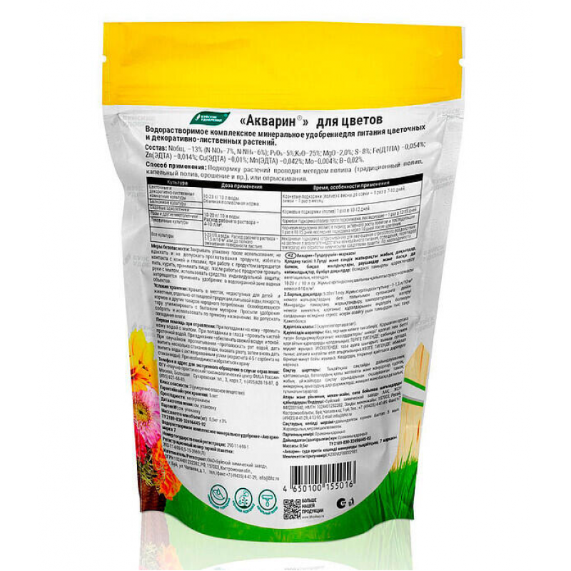 Сбалансированный состав NPK и микроэлементов; подходит для корневой и внекорневой подкормки; способствует пышному и длительному цветению; повышает устойчивость растений к стрессам; смягчает воздействие средств защиты растений; удобная водорастворимая форма; отечественное производство.