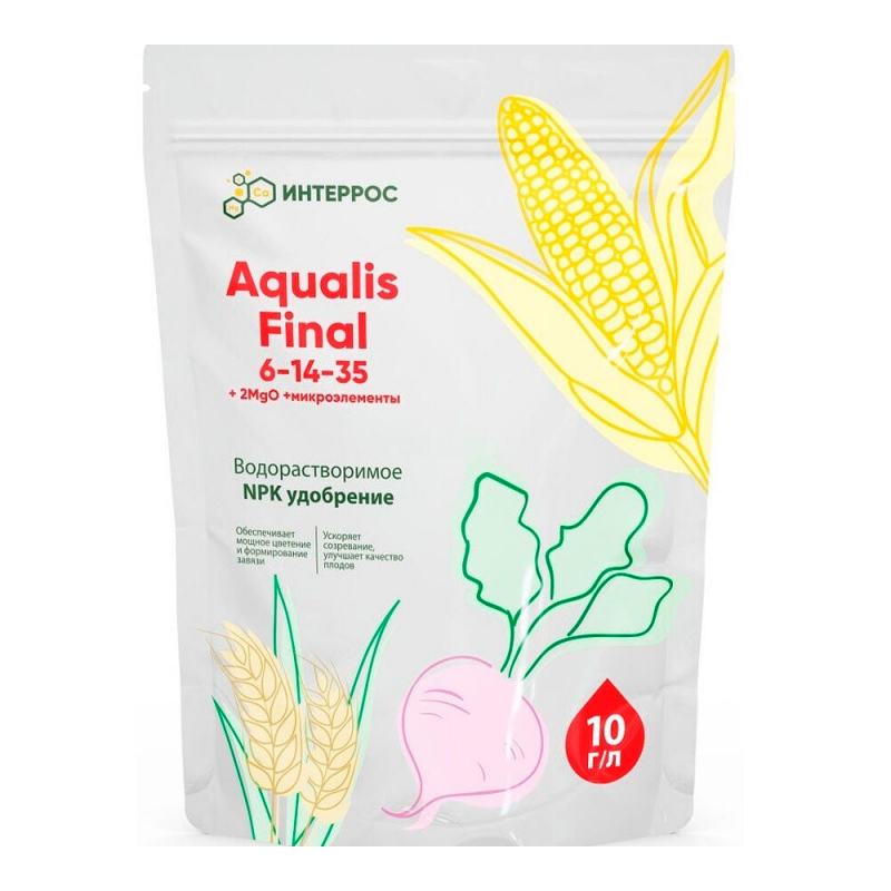 Удобрение Aqualis Final 6-14-35 — это водорастворимое минеральное удобрение от бренда Интеррос, предназначенное для всех видов растений. Сбалансированный состав с повышенным содержанием калия (35% K2O) и фосфора (14% P2O5) обеспечивает мощное цветение, активное формирование завязей и ускоренное созревание плодов, улучшая их качество. Удобрение обогащено комплексом микроэлементов, включая магний, бор, медь, марганец, цинк, железо и молибден, что способствует полноценному питанию растений на всех этапах роста. Выпускается в форме порошка, легко растворяется в воде, что делает его удобным для применения в системах капельного полива и внекорневых подкормок. Произведено в России компанией «ЕвроХим-Белореченские минудобрения». Рекомендуется для использования в садоводстве, огородничестве и цветоводстве.
