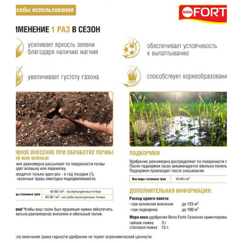 Удобрение BONA FORTE Газонное применяется для основного внесения при подготовке почвы под посев или укладку газона, а также для регулярных подкормок в течение сезона. Для основного внесения равномерно распределите гранулы по поверхности почвы из расчета 30–40 г на 1 кв. м (примерно 5 кг на 125–170 кв. м), затем заделайте в грунт и полейте. Для подкормки существующего газона рассыпьте удобрение по поверхности из расчета 20–30 г на 1 кв. м после скашивания и обильно полейте для быстрого растворения и усвоения. Рекомендуется проводить подкормки весной (для активного роста), летом (для поддержания цвета и устойчивости) и в начале осени (для укрепления перед зимовкой). Избегайте внесения в сухую почву и в период сильной жары. Храните в сухом месте.