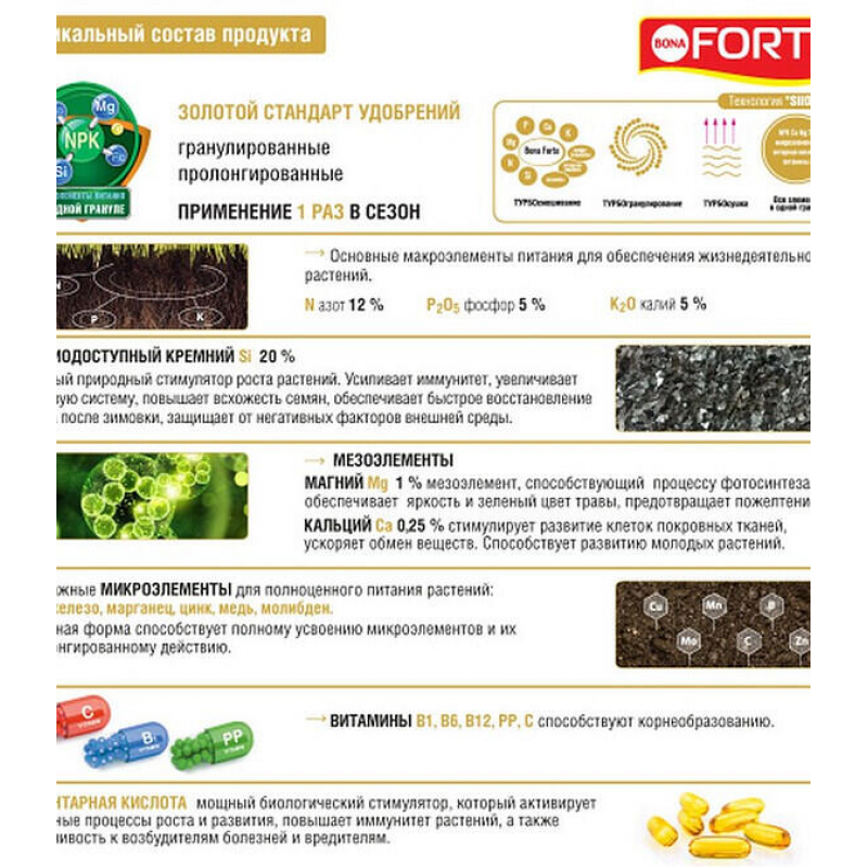 Удобрение BONA FORTE Газонное — комплексное минеральное удобрение в гранулах, специально разработанное для ухода за газонными травами. Оно эффективно восстанавливает травяной покров после скашивания, укрепляет и уплотняет его, способствуя формированию густого и ровного дерна. Удобрение придает газону сочный, ярко-зеленый цвет и повышает его устойчивость к засухе, вытаптыванию и другим неблагоприятным внешним условиям. Сбалансированный состав включает три основных макроэлемента (NPK: азот 12%, фосфор 5%, калий 5%), биодоступный кремний (20%), мезоэлементы (магний, кальций), шесть микроэлементов в хелатной форме (бор, железо, марганец, цинк, медь, молибден), комплекс витаминов (B1, B6, B12, PP, C) и стимулятор роста — янтарную кислоту. Такой состав не только обеспечивает полноценное питание, но и улучшает структуру почвы. Упаковки 5 кг хватает на площадь 125–170 кв. м.