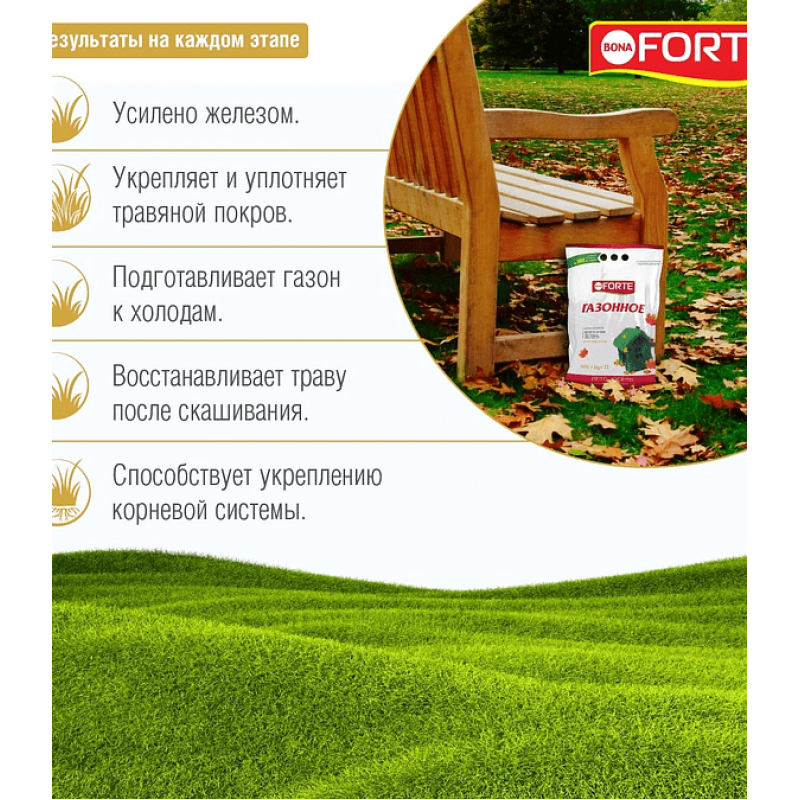 Удобрение BONA FORTE Газонное Осень — это специализированное минеральное удобрение, разработанное для подготовки газона к зиме. Содержит сбалансированный комплекс NPK (8% азота, 20% фосфора, 30% калия), а также серу, магний и шесть важнейших микроэлементов (бор, железо, марганец, цинк, медь, молибден) в хелатной, легкоусвояемой растениями форме. Его применение способствует укреплению травяного покрова, развитию мощной корневой системы и повышению общей зимостойкости газона. Удобрение помогает растениям накопить запас питательных веществ, что обеспечивает активный и здоровый старт в следующем вегетационном сезоне. Форма выпуска — удобные в применении гранулы. Фасовка 5 кг рассчитана на обработку значительной площади.