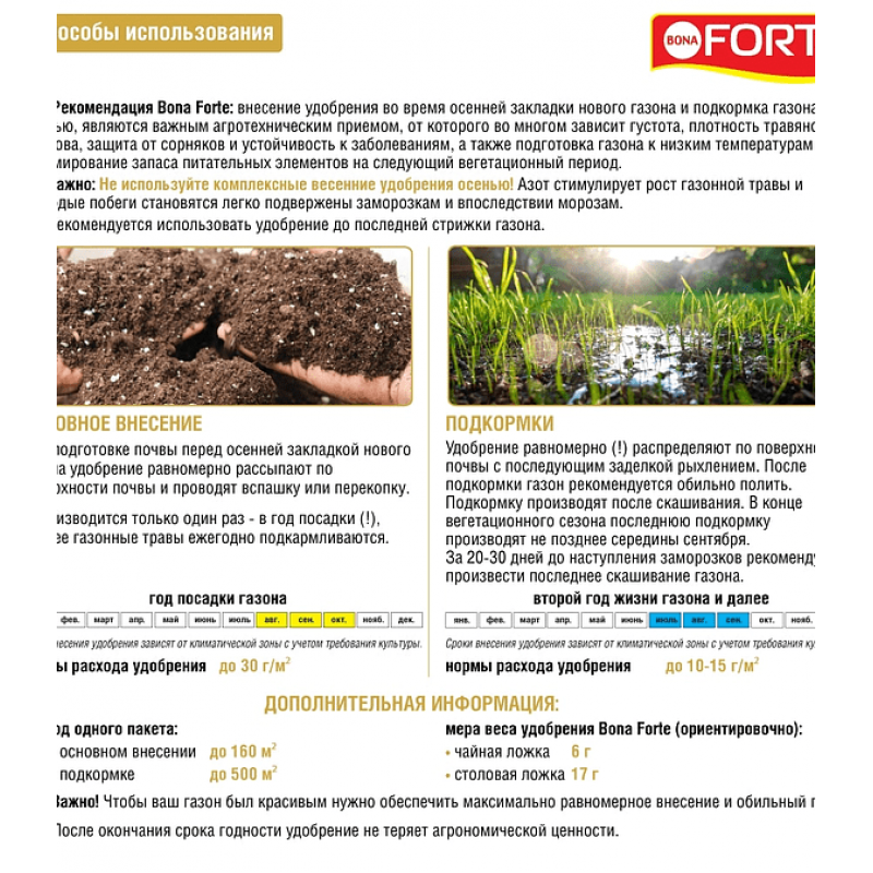 Удобрение применяется для осенней подкормки газона. Рекомендуется вносить в конце лета или начале осени (август-сентябрь). Гранулы равномерно распределяют по поверхности газона в сухом виде, после чего проводят обильный полив для их растворения и доставки питательных веществ к корням. Норма расхода зависит от состояния газона и указана на упаковке. Регулярное осеннее внесение данного комплекса помогает газону успешно перезимовать, минимизировать выпадение травы и обеспечить густую, яркую зелень с самой ранней весны. Перед применением ознакомьтесь с полной инструкцией на упаковке.