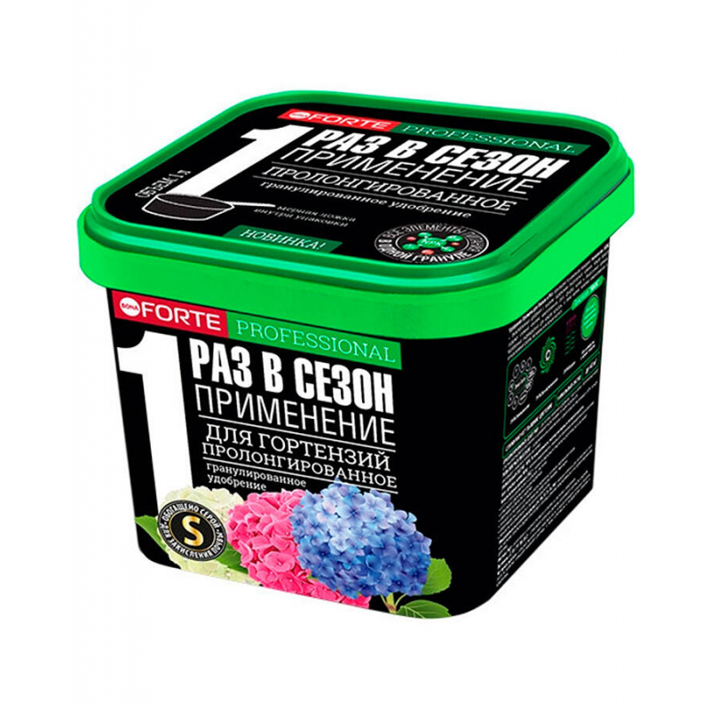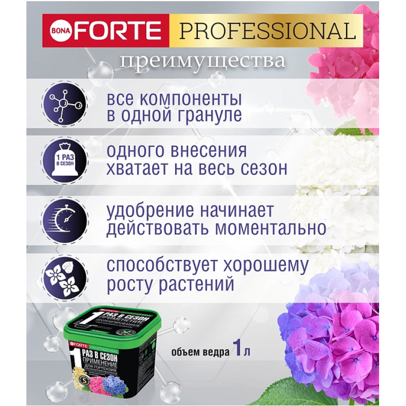 Удобрение BONA FORTE в гранулах — это специализированное минеральное питание пролонгированного действия для гортензий и других кислолюбивых культур. Оно создано по уникальной технологии «SIIOG», которая обеспечивает равномерное внесение, длительный эффект, хорошую растворимость и экономичный расход. Состав включает сбалансированный комплекс NPK (6,5%/9,5%/9,5%), биодоступный кремний (20%), серу (9%), мезо- и микроэлементы в хелатной форме, а также витамины группы B, C, PP и стимулятор роста — янтарную кислоту. Подходит для садовых и голубых гортензий, голубики, рододендронов и хвойных растений, способствуя их здоровому росту, яркому цветению и устойчивости к стрессам.