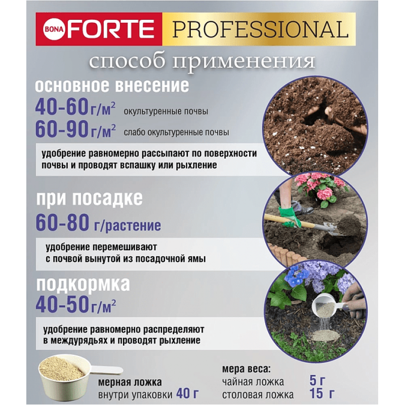 Удобрение применяется для корневой подкормки гортензий, голубики, рододендронов и хвойных культур. Гранулы равномерно распределяют по поверхности почвы в прикорневой зоне, после чего проводят неглубокое рыхление и обильный полив для активации. Рекомендуется использовать в период активной вегетации растений. Дозировка и частота применения зависят от фазы роста и вида культуры — следуйте инструкции на упаковке. Для достижения наилучшего результата соблюдайте график подкормок и учитывайте индивидуальные потребности растений.