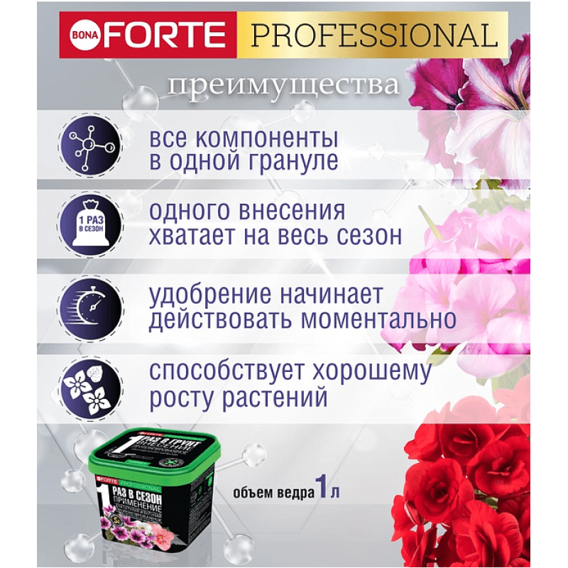 Удобрение BONA FORTE в гранулах — это специализированное минеральное питание пролонгированного действия для пышного цветения петуний и бегоний. Продукт произведён по уникальной технологии «SIIOG», которая обеспечивает равномерное внесение, длительный эффект, отличную растворимость и экономичный расход. Состав включает сбалансированный комплекс NPK (азот 7,5%, фосфор 7%, калий 7,5%), биодоступный кремний (20%), мезоэлементы (магний, кальций) и шесть микроэлементов в хелатной форме для лёгкого усвоения. Дополнен витаминами группы B, PP, C и стимулятором роста — янтарной кислотой. Удобрение способствует укреплению корневой системы, яркому и продолжительному цветению, повышает устойчивость растений к стрессам и болезням. Объём упаковки — 1 литр.