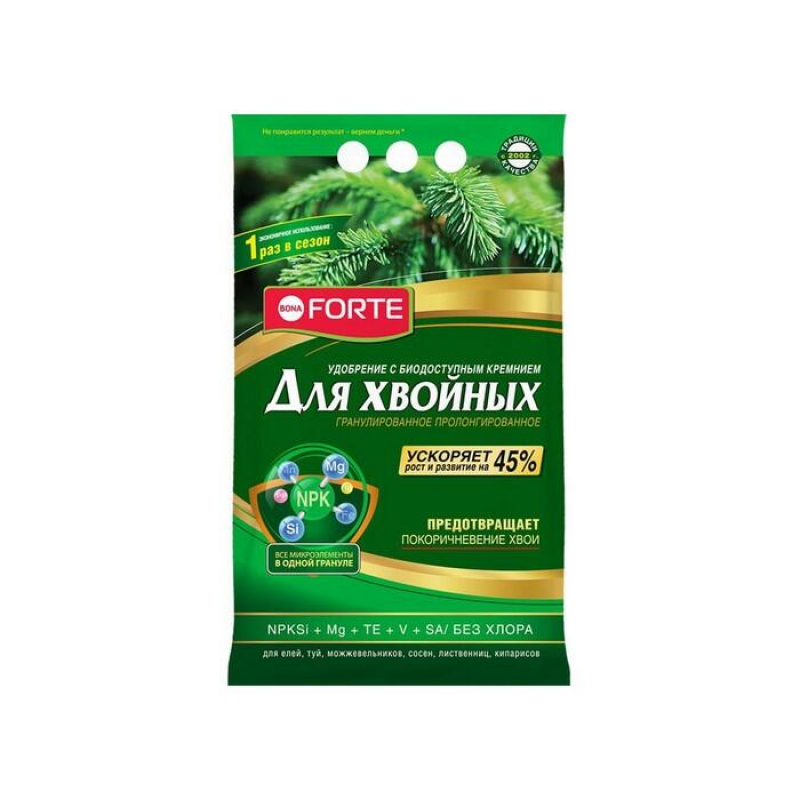 - Свойства:защищает от побурения хвои, стимулирует рост, укрепляет корневую систему, повышает иммунитет, обеспечивает растения питательными веществами