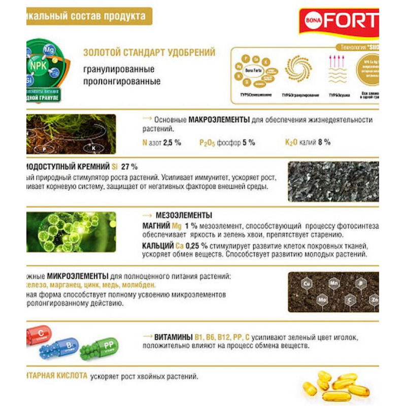 Сбалансированный состав для всех хвойных; Равномерное питание каждой гранулой; Пролонгированное действие на весь сезон; Содержит кремний, витамины и стимулятор роста; Предотвращает побурение хвои; Удобные в применении гранулы