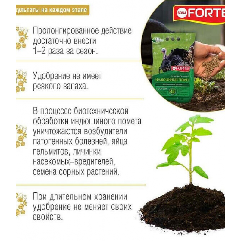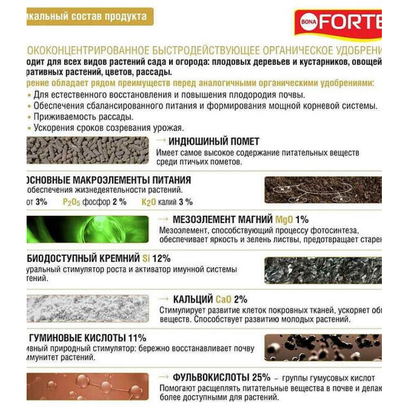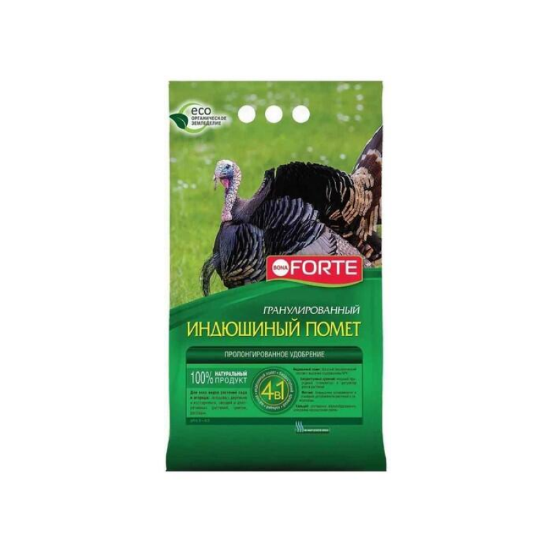 Удобрение BONA FORTE на основе индюшиного помета — это высококонцентрированное органическое удобрение в гранулах, предназначенное для всех видов садовых и огородных культур. Оно эффективно восстанавливает и повышает плодородие почвы, обеспечивает растения сбалансированным питанием, способствует развитию мощной корневой системы, улучшает приживаемость рассады и ускоряет созревание урожая. Продукт обогащен минеральным NPK-комплексом (азот, фосфор, калий), а также магнием, кремнием, кальцием, гуминовыми и фульвокислотами. В процессе обработки уничтожены патогены, яйца гельминтов и семена сорняков, что делает удобрение безопасным и удобным в применении без резкого запаха. Подходит для основного внесения, подкормок, приготовления почвосмесей и даже для выращивания грибов.
