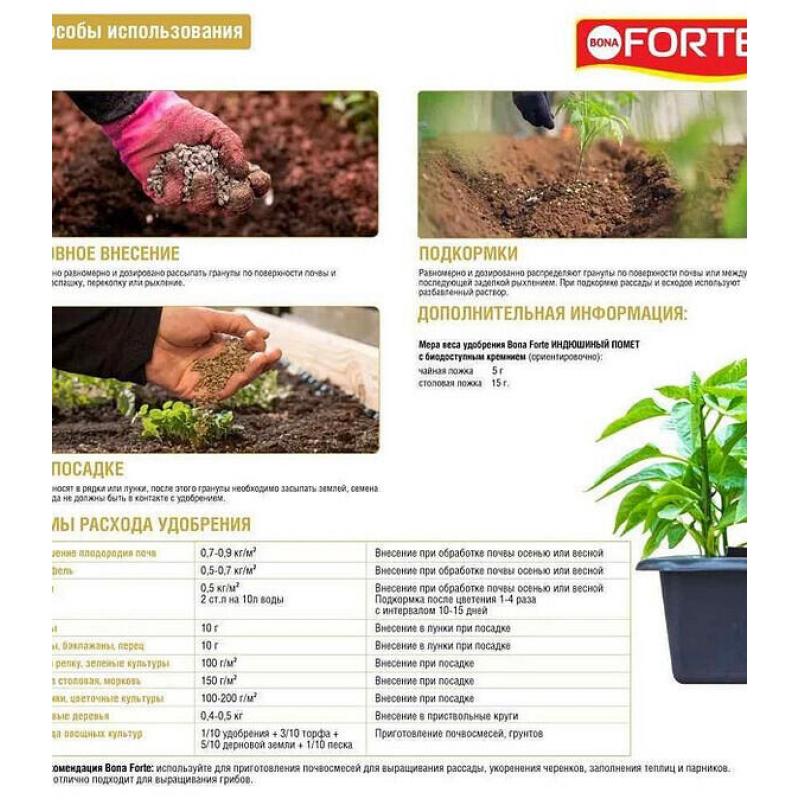 Для основного внесения равномерно рассыпьте гранулы по поверхности почвы и проведите перекопку или рыхление. При посадке вносите гранулы в лунки или рядки, обязательно засыпая их землей, чтобы избежать прямого контакта с семенами или рассадой. Для подкормок распределите удобрение между рядами или по поверхности с последующей заделкой в почву. Для рассады и всходов используйте разбавленный раствор. Рекомендуется также применять для приготовления почвосмесей, укоренения черенков, заполнения теплиц и парников, а также для выращивания грибов. Примерная мера веса: чайная ложка — 5 г, столовая ложка — 15 г.