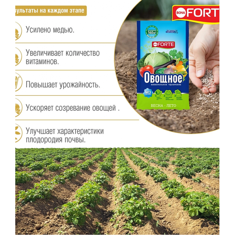 Удобрение BONA FORTE Овощное — это комплексное минеральное удобрение в гранулах, специально разработанное для подкормки широкого спектра овощных культур, включая томаты, огурцы, капусту, картофель, морковь, свеклу, зелень, лук, чеснок и перец. Оно содержит сбалансированный состав NPK (азот 10%, фосфор 20%, калий 20%), а также серу, магний и шесть важнейших микроэлементов (бор, железо, марганец, цинк, медь, молибден) в хелатной форме для легкого усвоения растениями. Удобрение предназначено для использования в открытом грунте, способствует усилению декоративности, стимулирует здоровый рост и обеспечивает полноценное питание овощей на всех этапах развития, повышая их урожайность и качество. Произведено в России, фасовка — 1 кг.