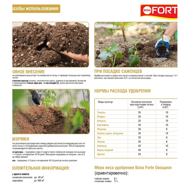 Удобрение BONA FORTE Овощное применяется для основного внесения в почву при подготовке грядок весной или осенью, а также для подкормок в период вегетации. При основном внесении равномерно распределите гранулы по поверхности почвы из расчета 30–60 г на 1 м² (точная дозировка зависит от культуры и состояния почвы, следуйте инструкции на упаковке), затем заделайте в грунт путем перекопки или рыхления. Для подкормок в течение сезона удобрение можно вносить в междурядья или прикорневую зону с последующим поливом. Регулярное применение обеспечивает овощные культуры необходимыми макро- и микроэлементами, способствуя активному росту, формированию завязей и повышению урожайности. Избегайте прямого контакта гранул с корнями и стеблями растений, соблюдайте рекомендуемые дозы.
