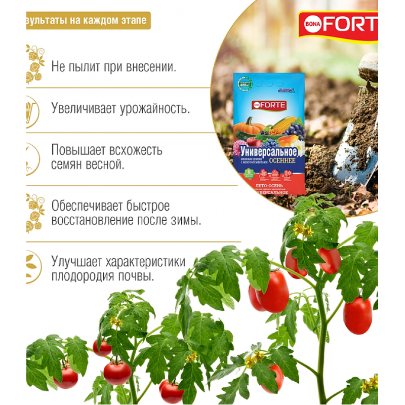 Удобрение BONA FORTE Универсальное Лето-Осень — это комплексное минеральное удобрение в гранулах, разработанное для полноценного питания всех видов растений открытого грунта в летне-осенний период. Оно содержит оптимальный баланс основных макроэлементов (NPK 6:18:34), а также серу, магний и шесть важнейших микроэлементов (бор, железо, марганец, цинк, медь, молибден) в хелатной, легкоусваиваемой форме. Это способствует усилению декоративности, стимулирует рост и укрепляет растения, подготавливая их к зиме. Идеально подходит для плодово-ягодных культур (яблоня, клубника, земляника), а также для любых других садовых и огородных растений. Удобрение фасуется в практичную упаковку весом 2,5 кг.