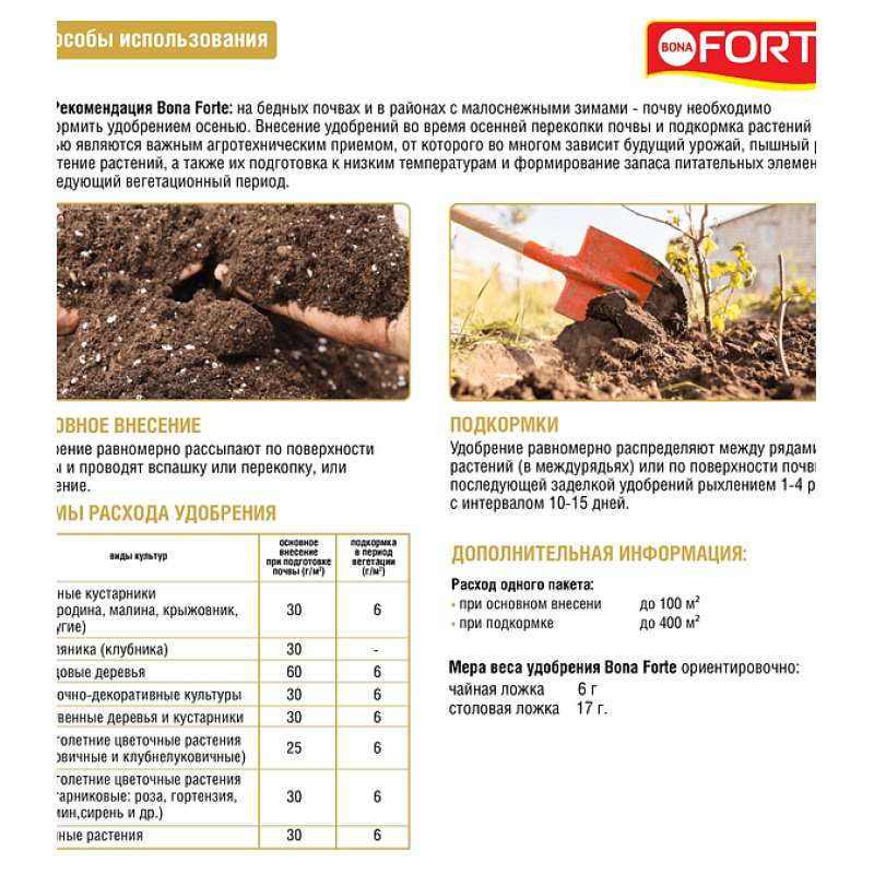 Удобрение применяется для основного внесения в почву при подготовке грядок, а также для подкормки растений в период вегетации. Гранулы равномерно распределяют по поверхности почвы с последующей заделкой на глубину корнеобитаемого слоя и обильным поливом. Для плодовых деревьев и кустарников удобрение вносят по проекции кроны. Рекомендуется применять согласно инструкции на упаковке, соблюдая дозировки для конкретных культур (ягодные, плодовые, декоративные). Регулярное использование обеспечивает растения необходимыми питательными веществами, повышает урожайность и улучшает зимовку. Перед применением уточняйте актуальную информацию у продавца.