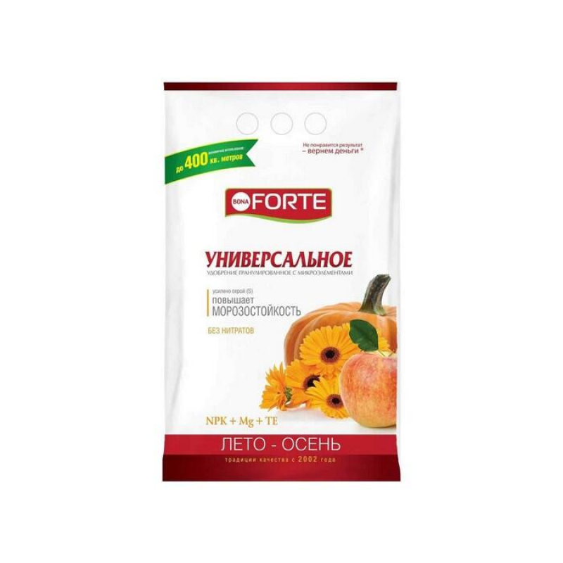 Удобрение BONA FORTE Универсальное Лето-Осень — это комплексное минеральное удобрение в гранулированной форме, разработанное для полноценного питания всех видов растений в период активного роста и подготовки к зиме. Содержит оптимальное соотношение основных макроэлементов NPK (азот 6%, фосфор 18%, калий 34%), а также серу, магний и шесть важнейших микроэлементов (бор, железо, марганец, цинк, медь, молибден) в хелатной форме для максимального усвоения. Препарат стимулирует интенсивный рост, укрепляет корневую систему, повышает устойчивость растений к неблагоприятным факторам и улучшает структуру почвы. Упаковки 5 кг достаточно для обработки площади от 200 до 800 кв.м в зависимости от способа внесения (основное или подкормка). Произведено в России.
