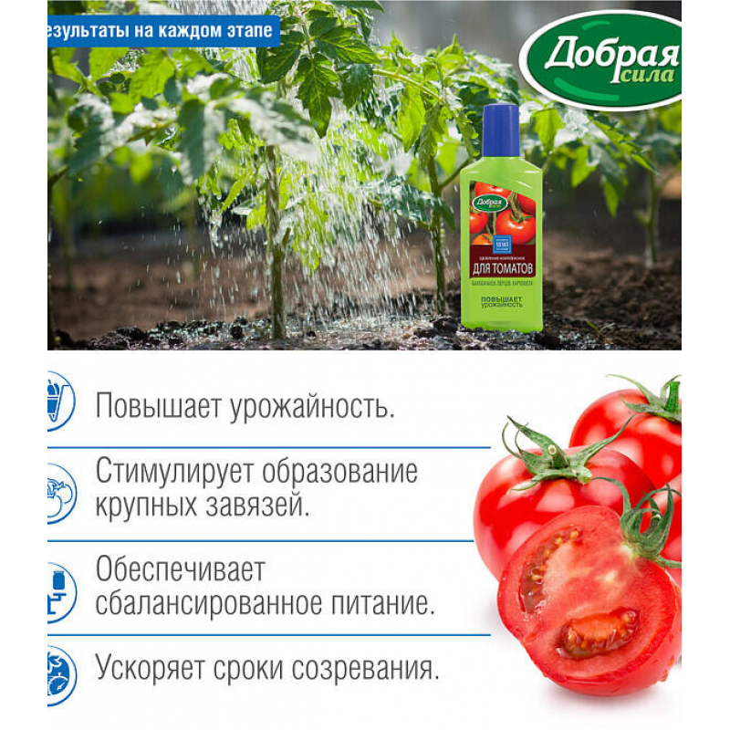 Удобрение ДОБРАЯ СИЛА — это органоминеральный водный концентрат, специально разработанный для полноценного питания пасленовых культур: томатов, баклажанов и перцев. Содержит сбалансированный комплекс NPK (3% азота, 2,5% фосфора, 6% калия), гумат (0,3%) и семь важнейших микроэлементов (бор, железо, марганец, цинк, медь, молибден, кобальт). Это обеспечивает растения всем необходимым для активного роста, укрепления корневой системы, обильного цветения и формирования крупных, качественных плодов. Удобрение способствует повышению урожайности и устойчивости растений к неблагоприятным условиям. Произведено в России, фасовка — 250 мл.