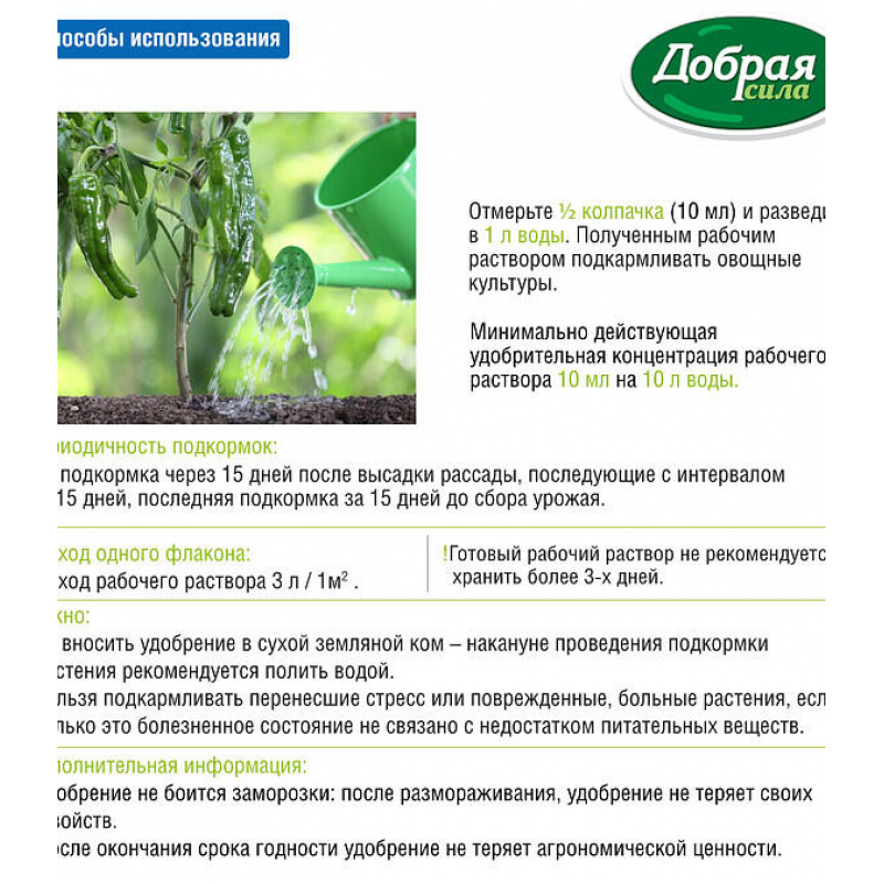 Перед использованием концентрат необходимо развести в воде согласно инструкции на упаковке. Обычно применяется для корневой подкормки в период активного роста и плодоношения растений. Рекомендуется поливать растения под корень предварительно увлажненной почвы. Подкормки можно проводить с интервалом 10-14 дней. Для внекорневой подкормки (опрыскивания по листу) используйте более слабый раствор. Избегайте попадания удобрения на цветки. Для достижения наилучшего результата соблюдайте дозировку и регулярность внесения, а также основные правила агротехники.