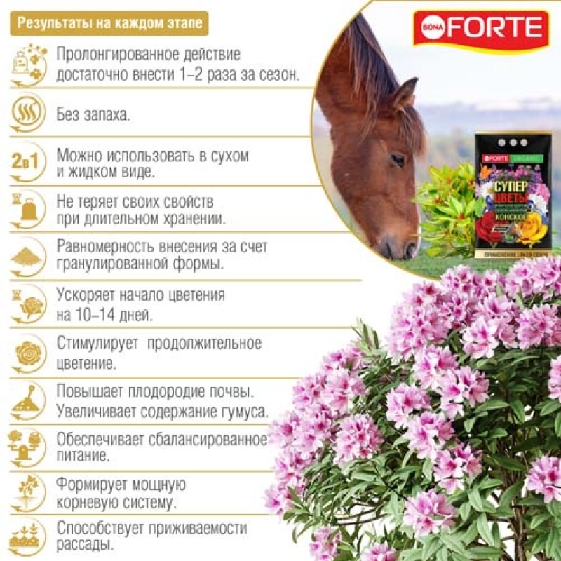 Удобрение Конское Премиум Органическое Супер Цветы BONA FORTE — это высококачественное органическое удобрение, специально разработанное для цветочных и декоративных растений. Оно содержит сбалансированный комплекс питательных веществ: азот (4%), фосфор (3,3%), калий (4,5%) и кремний (2%), а также богатый набор аминокислот, включая аланин, аргинин, валин и другие. Эти компоненты способствуют естественному восстановлению и повышению плодородия почвы, обеспечивают полноценное питание растений, укрепляют корневую систему и ускоряют начало цветения. Удобрение выпускается в форме гранул, удобных для применения. Производится в России компанией АО «Русинхим». Вес упаковки — 2 кг. Перед покупкой рекомендуется уточнять актуальные характеристики и наличие в конкретном магазине.