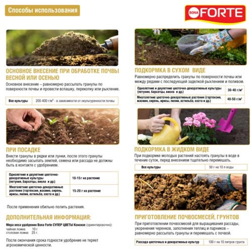 Для достижения наилучших результатов равномерно распределите гранулы удобрения по поверхности почвы вокруг растений, слегка заделайте в грунт и обильно полейте. Рекомендуется применять в период активного роста и бутонизации цветочных и декоративных культур. Дозировка зависит от типа растений и состояния почвы — следуйте инструкции на упаковке. Регулярное использование способствует длительному и пышному цветению, улучшает структуру почвы и обеспечивает растения необходимыми питательными элементами. Храните удобрение в сухом месте, вдали от детей и домашних животных.