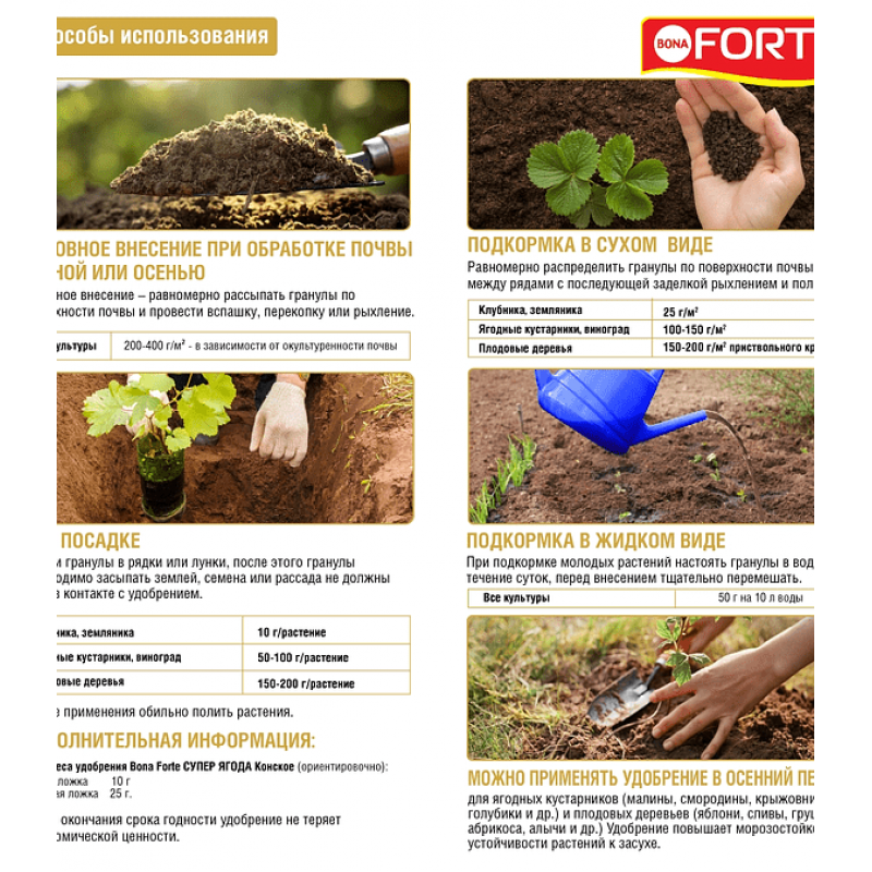 Для достижения наилучших результатов при использовании удобрения Конское Премиум Органическое Супер Ягоды BONA FORTE рекомендуется равномерно распределить гранулы по поверхности почвы в зоне корневой системы ягодных культур (например, клубники, малины, смородины, крыжовника) с последующей неглубокой заделкой в грунт. Проводите подкормку в период активного роста растений, перед цветением и во время формирования завязей. Удобрение можно применять как при посадке рассады, так и для подкормки уже укоренившихся кустов. Регулярное использование способствует повышению урожайности, улучшению вкусовых качеств ягод и общему укреплению растений. Соблюдайте дозировку, указанную на упаковке, и избегайте прямого контакта гранул с корнями при посадке.
