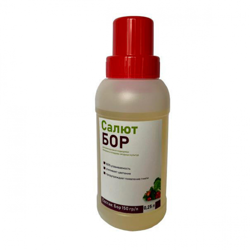Удобрение Салют Бор — это жидкое минеральное удобрение в форме водного концентрата, предназначенное для листовой подкормки растений. Содержит бор (150 г/л) и азот, что особенно важно для двудольных культур, включая плодово-ягодные растения. Бор играет ключевую роль в репродуктивных процессах: усиливает рост пыльцевых трубок и прорастание пыльцы, увеличивает количество цветков и плодов, а также способствует оттоку сахаров из листьев к репродуктивным органам. Растения нуждаются в боре на всех этапах роста, что делает это удобрение универсальным для поддержания их здоровья и продуктивности. Произведено в Беларуси брендом Агросемпродукт, фасовка — 0,25 л.