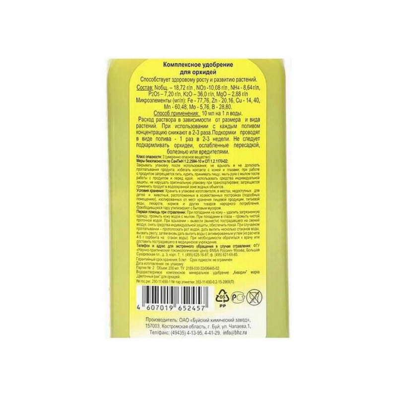 Удобрение ЦВЕТОЧНЫЙ РАЙ для орхидей — это сбалансированный минеральный концентрат, разработанный специально для требовательных комнатных орхидей. Его формула содержит оптимальное соотношение основных питательных элементов (азот, фосфор, калий, магний) и комплекс важнейших микроэлементов в хелатной форме (железо, марганец, цинк, медь, молибден, бор). Препарат стимулирует здоровый рост, укрепляет корневую систему и иммунитет растений, способствуя пышному и продолжительному цветению. Регулярное применение улучшает внешний вид листьев и цветков, а также помогает предотвратить заболевания, вызванные дефицитом питания. Удобрение легко использовать: водорастворимый концентрат экономичен и подходит для корневой подкормки. Продукт производится в России на Буйском химическом заводе, что гарантирует высокое качество и эффективность.