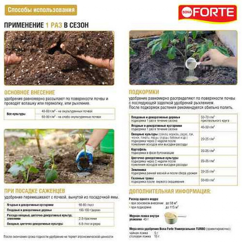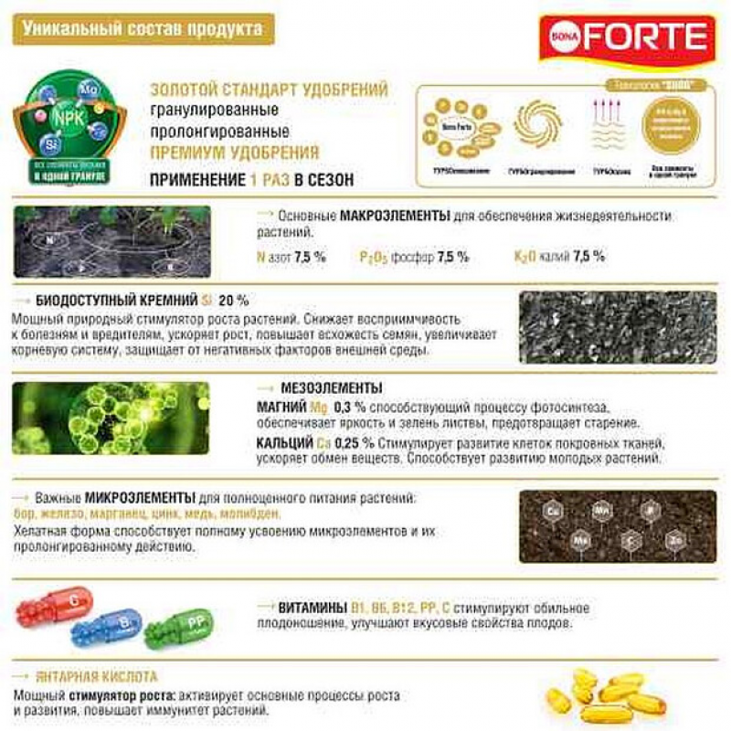 Удобрение универсальное Bona Forte Turbo с биодоступным кремнием (3 л) — минеральное гранулированное удобрение, подходящее для широкого спектра садовых растений, включая овощи, плодово-ягодные культуры, цветущие и декоративные растения, а также газонные травы. Состав включает три основных макроэлемента (NPK): азот (7,5%), фосфор (7,5%), калий (7,5%) и биодоступный кремний (20%), а также мезоэлементы магний (0,3%) и кальций (0,25%). Включает шесть микроэлементов в хелатной (легко усваиваемой) форме, комплекс витаминов B1, B6, B12, PP, C и стимулятор роста — янтарную кислоту.