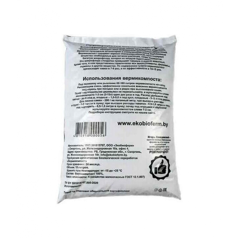 Вермикомпост от Экобиоферм — это высококачественное органическое удобрение, созданное на основе переработанной дождевыми червями органики. Оно содержит сбалансированный комплекс питательных веществ: азот (более 0,35%), оксид фосфора (более 0,35%), оксид калия (более 0,25%) и органическое вещество (свыше 65%). Удобрение имеет нейтральную кислотность (pH 7-8), что делает его безопасным для всех видов растений. Оно эффективно питает корневую систему, повышает устойчивость культур к болезням, стрессам и неблагоприятным погодным условиям. Регулярное применение вермикомпоста улучшает структуру почвы, увеличивает урожайность, а также усиливает вкусовые и питательные качества плодов. Упаковка 15 л (вес около 7 кг) удобна для использования в саду, огороде и для комнатных растений.