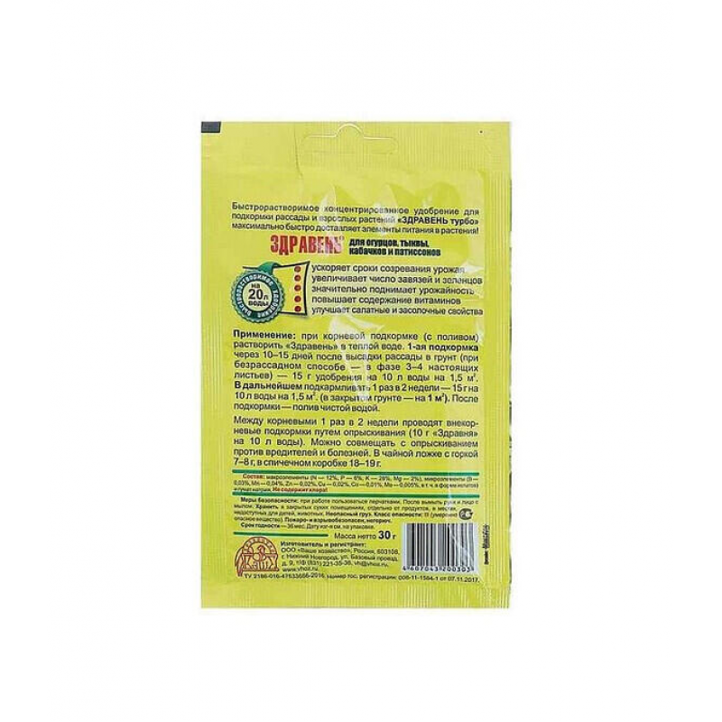 Удобрение ЗДРАВЕНЬ ТУРБО — это специализированное минеральное удобрение для огурцов, тыквы, кабачков и патиссонов, разработанное для повышения урожайности и качества плодов. Сбалансированный состав включает макроэлементы (азот 12%, фосфор 6%, калий 28%, магний 2%, гумат натрия 2%) и микроэлементы (бор, марганец, цинк, медь, молибден) в хелатной форме, что обеспечивает легкое усвоение растениями. Препарат ускоряет сроки созревания, увеличивает количество завязей и зеленцов, а также улучшает салатные и засолочные свойства урожая. Гранулированная форма удобна в применении и способствует равномерному питанию культур. Произведено в России компанией «Ваше хозяйство», фасовка 30 г.