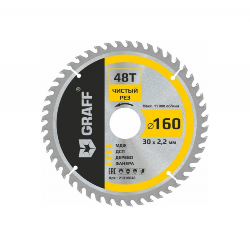 Пильный диск по дереву 160x1.4/2.2x30/25.4/20/16 мм, 48Т, чистовая обработка GRAFF 21316048 предназначен для поперечного или продольного распила древесины, ДСП, фанеры и МДФ.