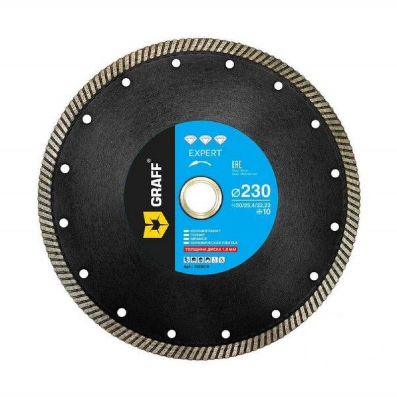 Профессиональный алмазный диск GRAFF серии Expert для резки керамогранита, гранита, мрамора и керамической плитки. Специальная форма режущей кромки позволяет получить более ровный и быстрый рез для таких твердых материалов как гранит и природный камень. Круги данного типа могут применяться для резки природного и искусственного камня, а также керамической плитки.