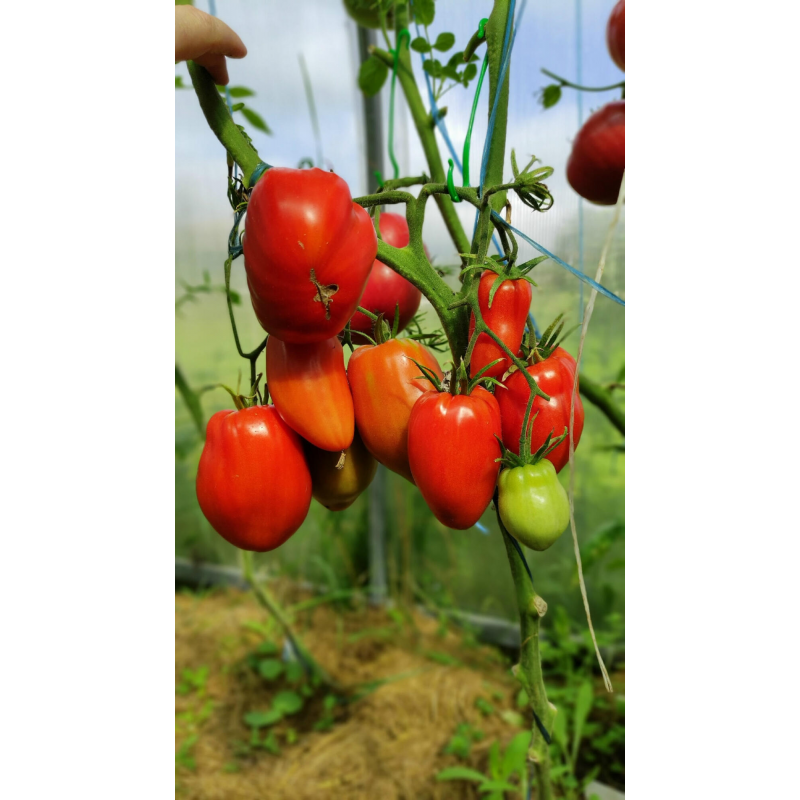 Плоды красные, удлиненно-овальные, слегка ребристые, 3-5 шт в кисти, вес варьируется от 200 до 500 г. Мякоть мясистая, малосемянная, насыщенного томатного вкуса со сладостью.
