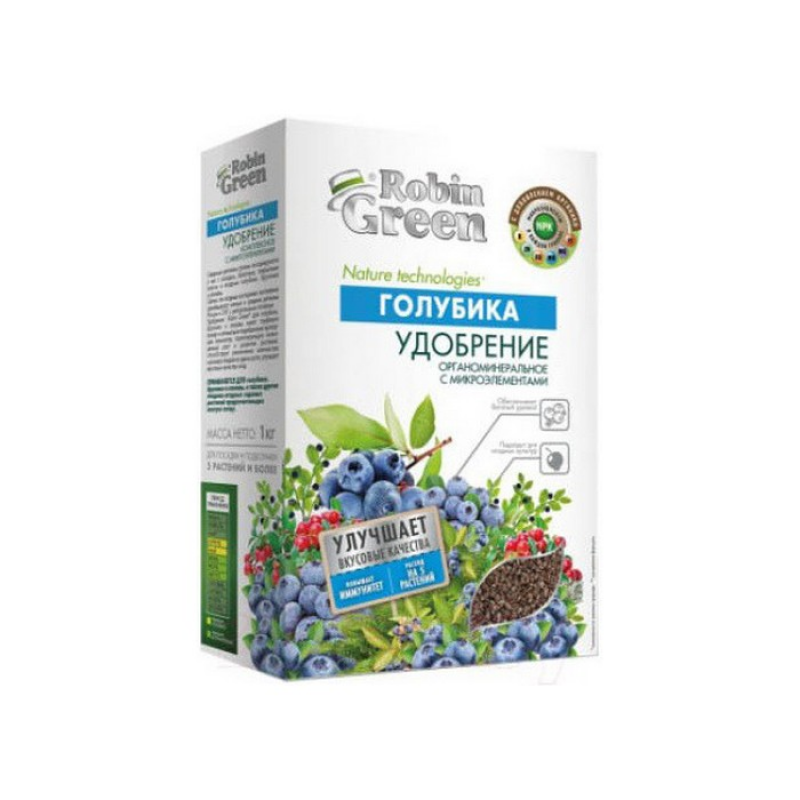 Удобрение сухое Робин Грин органоминеральное для голубики является сбалансированной подкормкой, использующейся при выращивании голубики. Комплексная добавка отличается увеличиванием сахаристости плодов, развития сильных кустов и обильного плодоношения. Подкормка улучшает структуру и плодородие почвы, повышает вкусовые качества урожая, а также увеличивает сроки его сохранности. Питательное удобрение сформировано в гранулу. Таким образом, органоминеральные частицы предотвращают вымывание из почты и способствуют более длительной отдаче полезных элементов. Инструкция по применению:При посадке:Внесите в подготовленную посадочную яму минеральное удобрение в количестве 100 - 150 г на одну яму (в зависимости от размера саженца) и перемешайте его с грунтом. Насыпьте грунт на дно посадочной ямы слоем 5-10см. Установите растение на дно ямы, так, чтобы избежать заглубления корневой шейки. Постепенно заполните грунтом пространство между комом и стенками посадочной ямы, периодически уплотняя слои. Полейте посаженное растение из расчета 8-10л. на яму. Замульчируйте саженец грунтом слоем 3-5см. в зависимости от величины саженца. Воздержитесь от использования подкормок в год посадки. Подкормка растений:Подкармливайте растения минеральным удобрением с микроэлементами 1 раз в 14-20 дней из расчета 5-15 г под один куст. Начиная со следующего года после посадки следует вносить минеральные удобрения на хорошо-окультуренных почвах 50-70 г/м2 и 80-100 г/м2 - на слабо окультуренных почвах. Равномерно распределите удобрение по площади разрастания корневой системы и аккуратно заделайте граблями в землю.