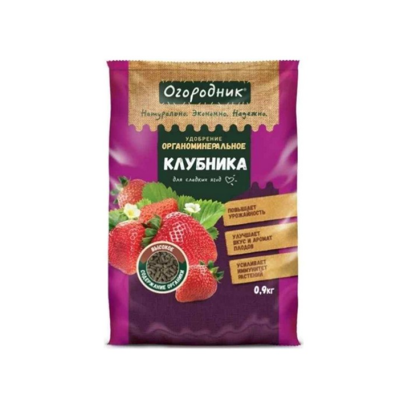 Удобрение для Клубники Огородник органоминеральное гранулированное 0,9 кг - комплексное бесхлорное гранулированное удобрение пролонгированного действия. Легкодоступный комплекс питательных элементов сформирован в гранулу, которая постепенно растворяется в почве, обеспечивая пролонгированное и равномерное питание растений. Органические соединения эффективно улучшают плодородие и структуру почвы, содержат гуминовые кислоты, стимулирующие иммунную систему растений и развитие мощной корневой системы, ускоряют обменные процессы, снижая содержание нитратов и увеличивая количество витаминов, сахаров и других ценных веществ в плодах. Органоминеральное удобрение Огородник стимулирует процесс образования завязей клубники, улучшает вкус и аромат плодов, повышает иммунитет растений и их способность противостоять болезням и неблагоприятным факторам окружающей среды. Применение/Норма внесения:Для внесения удобрения необходимо равномерно распределить его по поверхности почвы и заделать перекопкой или рыхлением. Внесение удобрения нужно делать под перекопку (вспашку, рыхление) почвы и в подкормку осенью после сбора урожая или весной в начале вегетации. Для окультуренной почвы 40-60 г/м2, для слабоокультуренной почвы 60-100 г/м2. Не содержит хлора, негативно влияющего на рост и развитие растений.