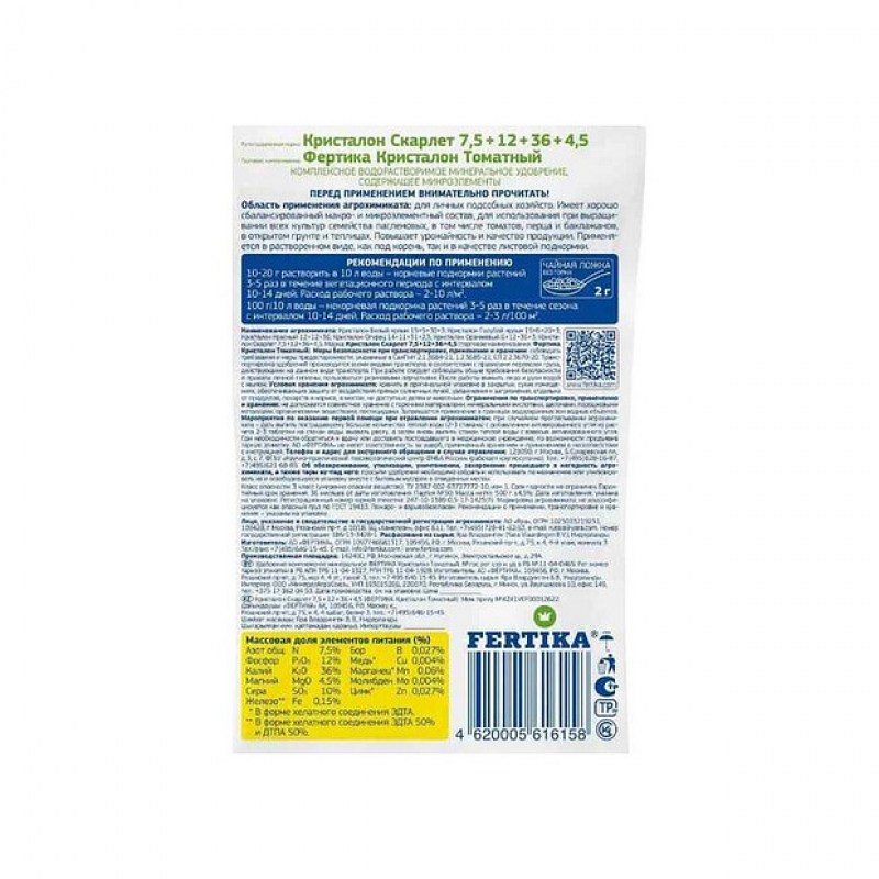 Удобрение FERTIKA Кристалон Томатный, минеральное - полностью водорастворимое комплексное азотно-фосфорнокалийное удобрение, содержащее микроэлементы. Имеет хорошо сбалансированный макро- и микроэлементный состав для использования при выращивании всех культур семейства пасленовых, в том числе томатов, перца и баклажанов, в открытом грунте и теплицах. Повышает урожайность, а также качество плодов. Применяется в виде водного раствора, как под корень, так и в качестве листовой подкормки в течение периода вегетации растений. Применение: При выращивание овощных культур: Для культур защищенного грунта при каждом поливе использовать 0,1-0,2%-ный раствор (10-20 г/10 л воды). Для овощей и цветов открытого грунта также применяют 0,1-0,2% раствор 1 раз в 2 недели. Листовая подкормка: Обработку проводят 1% раствором (10 г растворяют в 1 л воды, при использовании опрыскивается). При необходимости повторить через 7-10 дней. При выращивание рассады: 10 г продукта растворяют в 10 л воды и этим раствором рассада поливается один раз в неделю.