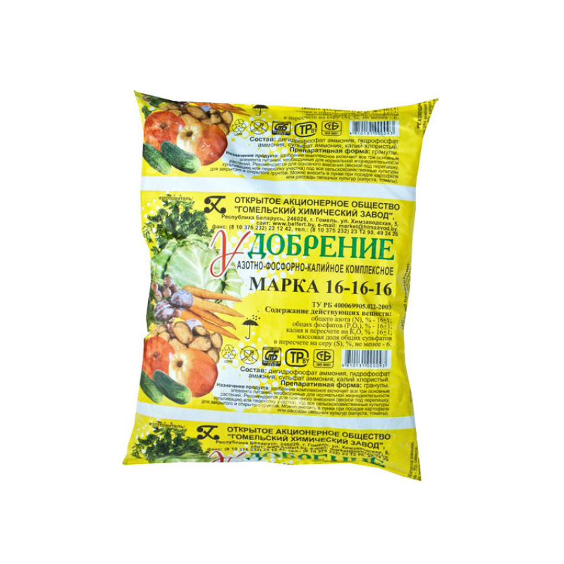 Удобрение комплексное включает все три основные элементы питания, необходимые для нормальной жизнедеятельности растений. Оптимальный подбор азота, фосфора и калия этой марки способствует гармоничному развитию растения. Азот - развивает корневую систему и ускоряет рост растения. Фосфор - укрепляет растение, увеличивает срок цветения и ускоряет созревание плодов, повышает морозоустойчивость растения. Калий - способствует своевременному вызреванию плодов, сопротивлению грибковым заболеваниям, улучшает вкусовые качества (путем повышения сахаристости и крахмалистости) и повышает морозоустойчивость растения. Рекомендуется для основного внесения (весной или осенью под перепашку, культивацию или перекопку участка) под все сельскохозяйственные культуры для закрытого и открытого грунтов. Удобрение комплексное можно вносить в лунки при посадке картофеля или рассады овощных культур. Оптимальные дозы для внесения в почву:- картофель - 30 г/м2;- капуста ранняя, редис, лук, чеснок - 50 г/м2;- капуста поздняя - 8 г/м2;- морковь - 50 г/м2;- фасоль, морковь - 70 г/м2;- свекла столовая - 50-60 г/м2;- огурцы - 75 г/м2;- томаты - 90 г/м2;- земляника - 15 г/м2. Для подкормки под плодовые деревья весной вносят 20-25 г на 1 м2 приствольного круга, под ягодные кустарники - 20-25 г. Удобрение комплексное, содержащее общий азот более 10%, полностью удовлетворяет потребность указанных культур в азоте, фосфоре, калии. При применении удобрения комплексного, содержащего общий азот менее 10%, под культуры с более длительным периодом вегетации (капуста поздняя, морковь, свекла столовая, картофель позднеспелый) требуются дополнительные подкормки азотным удобрением (карбамид, сульфат аммония). Для подкормки комнатных цветов готовят раствор (15-20 г удобрения на 10 л воды) и поливают цветы через каждые 7-12 дней. Чайная ложка вмещает 4-5 г, столовая ложка - 14-17 г, спичечный коробок - 20-22 г, стакан (200 см3) - 245-260 г удобрения.