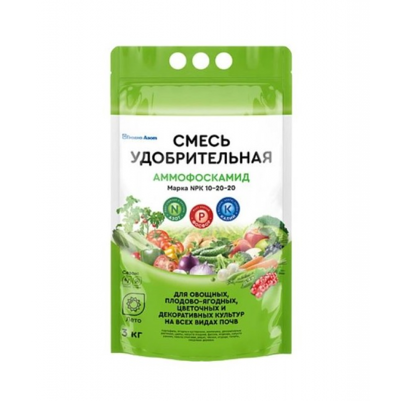Лауреат конкурса «Лучшие товары Республики Беларусь – 2014»Предназначено для применения в качестве удобрения при выращивании овощных, плодово-ягодных, цветочных и декоративных культур на всех видах почв. При основном внесении в почву перед посевом удобрение способствует повышению урожайности корнеплодов (для моркови на 267 ц/га) и улучшение их качества за счет снижения содержания нитратов, по сравнению с внесением смеси стандартных удобрений. Рекомендации по применению: основное удобрение вносится весной при перекопке почвы в следующих количествах (в г на м2): картофель - 60-80; ягодные кустарники - 25-35; земляника - 20-30; декоративные растения, цветы - 25-35; капуста поздняя - 60; фасоль, морковь - 50; капуста ранняя, свекла столовая, редис, чеснок - 50-60; огурцы - 60; томаты - 50; плодовые деревья (на одно дерево в зависимости от возраста) - 150-200. Подкормку плодовых деревьев и ягодных кустарников проводят после цветения.