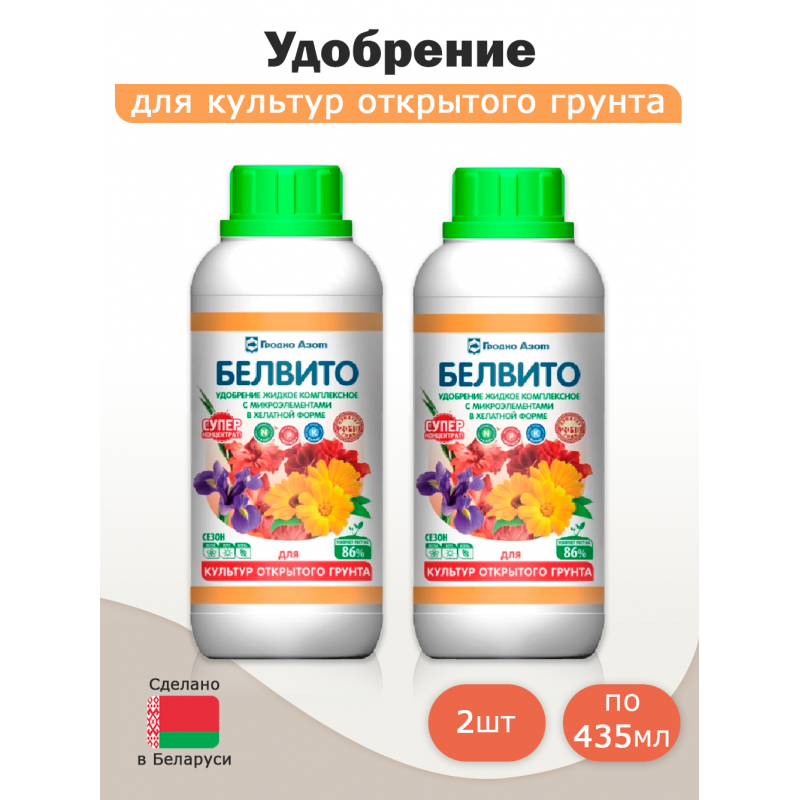 Серия жидких комплексных удобрений с микроэлементами БЕЛВИТО предназначеных для подкормки комнатных растений, балконных цветов, хвойных культур, растений открытого грунта. Удобрение «БЕЛВИТО» представляет собой водный раствор солей макро- и микроэлементов, взятых в оптимальных соотношениях. Препаративная форма: водный раствор. Предназначено для подкормки комнатных, однолетних и многолетних декоративных растений открытого грунта, хвойных культур. По результатам исследований урожай моркови, без использования наших удобрений, 448 ц/га. Используя наши удобрения урожай возрастает до 857(+90%) ц/га . Рекомендации по применению: Содержимое флакона взболтать. 1-2 колпачка (10 мл) удобрения развести в 2,5 л воды. Полученный раствор использовать как поливочную воду – летом 1-2 раза в неделю, зимой – 1-4 раза в месяц в зависимости от требовательности культур к питанию. При выращивании культур гидропонным способом раствор заменять каждые 4-6 недель.