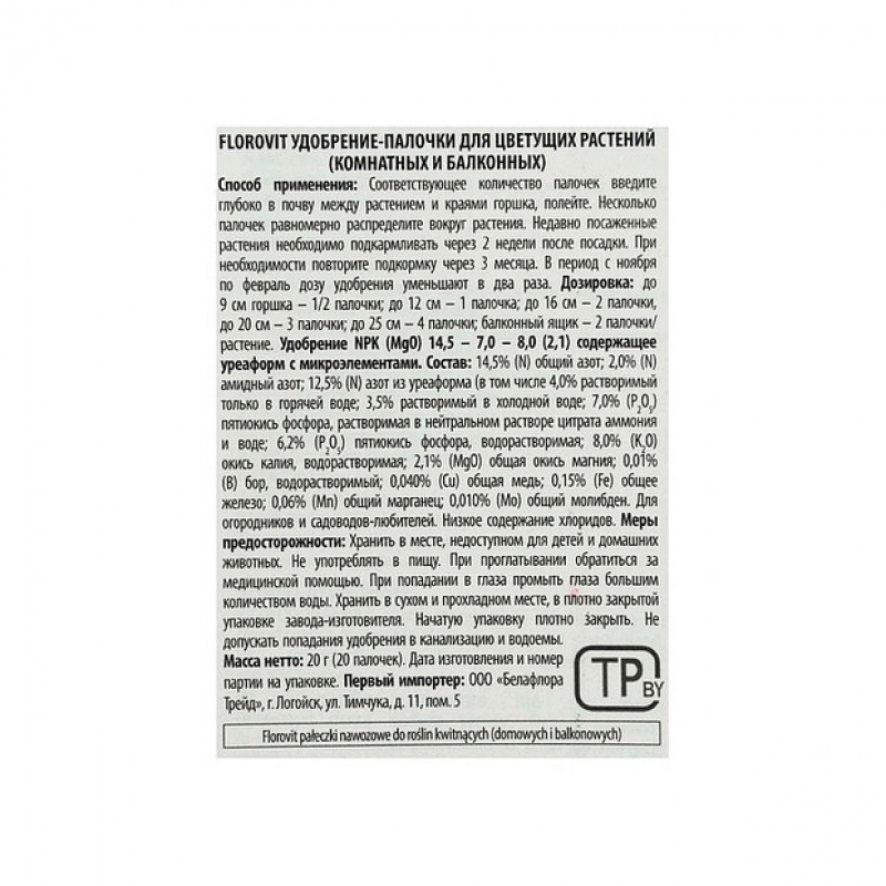 Палочки удобрительные являются наиболее подходящим удобрением для цветущих растений. Удобрение является комплексом микро- и макроэлементов и обеспечивает долговечность и здоровье растения. Скорость растворения палочек зависит от частоты полива. Отсутствует риск переудобрения. Дозировка: Диаметр горшка - Кол-во палочек: до 9 см - 1/2; до 12 см - 1; до 16 см - 2; до 20 см - 3; до 25 см - 4. Использовать в соответствии с инструкцией на упаковке.