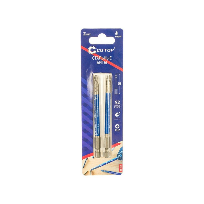 Набор стальных бит Profi (2 шт; PH2; 100 мм) CUTOP 83-340 предназначен для шуруповертов и гайковертов. Биты произведены по технологии CUTOP, ресурс от 2000 шт. саморезов. Ребра биты производятся с помощью холодной штамповки, кончик проходит специальный процесс закалки при температурах до 870°C, что увеличивает срок службы и обеспечивает высокую точность.