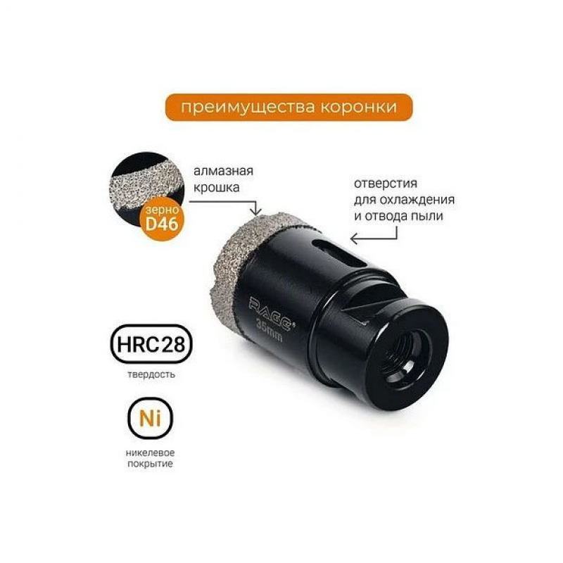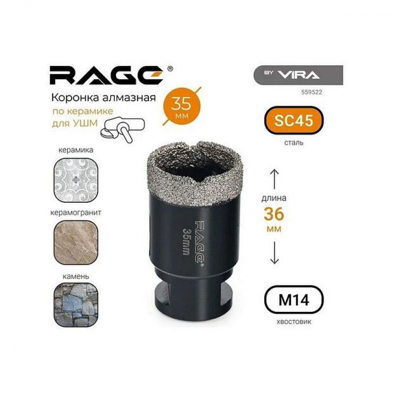 Алмазная коронка по керамике VIRA Rage 35мм используется для сухого и мокрого сверления отверстий правильной круглой формы. Подходит для обработки керамогранита, камня или керамической плитки.