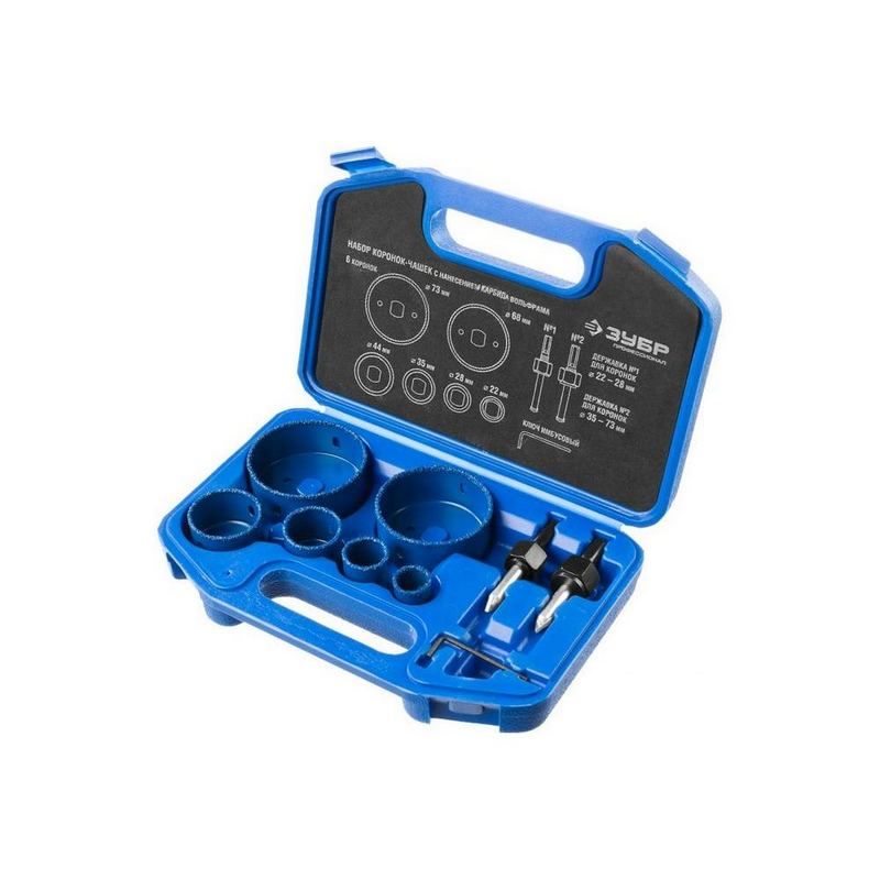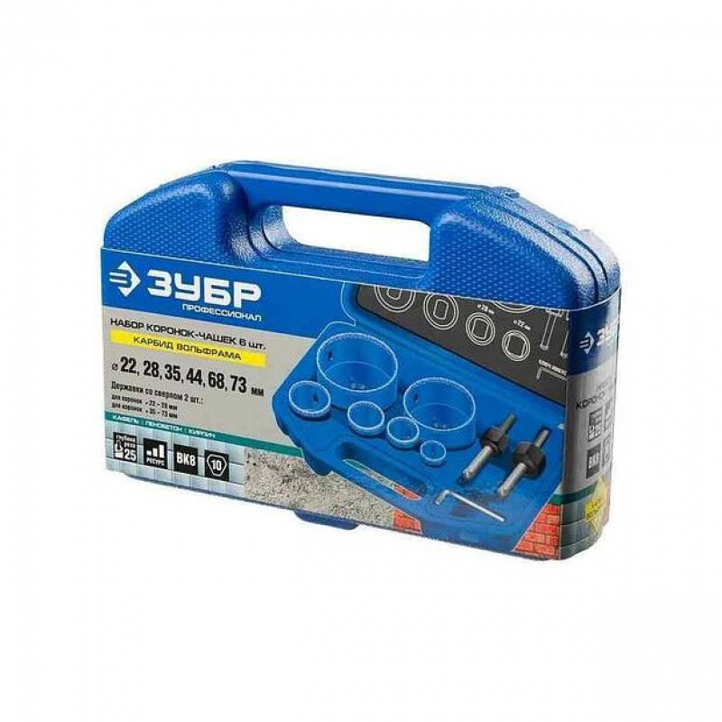 Набор ПРОФЕССИОНАЛ коронки-чашки Зубр 33360-H6 предназначен для безударного сверления отверстий больших размеров в различных материалах, таких как кирпич, бетон, кафельная и керамическая плитка. Коронки изготовлены из качественной углеродистой стали с карбид-вольфрамовым напылением, которое обеспечивает сверление без трещин и сколов. Наконечник выполнен из твердого сплава ВК8.