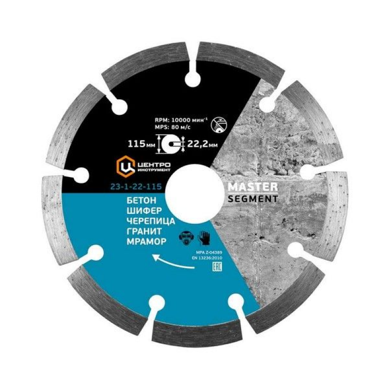 Диск алмазный отрезной Сегментный Центроинструмент 23-1-22-115 предназначен для угловых шлифовальных машин и другого камнерезного оборудования. Применяется для сухого реза ацеита, шифера, черепицы, гранита, мрамора. Диск обеспечивает быстрый и эффективный рез без перегрева алмазного слоя.