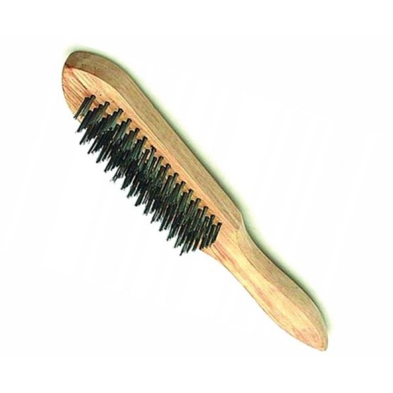 Шестирядная проволочная щетка VOREL 06960 из оцинкованной стальной проволоки, встроенной в деревянный корпус. Используется для удаления ржавчины, старых лакокрасочных покрытий или других загрязнений.