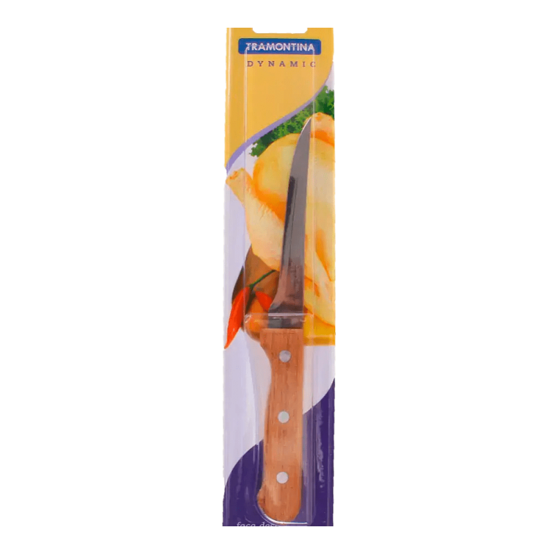 Универсальность для различных кухонных задач; Эргономичная деревянная ручка для удобного хвата; Прочное стальное лезвие длиной 12 см; Классический дизайн с коричневой ручкой; Легкий вес (0.08 кг) для комфортного использования; Производство Tramontina в Бразилии, гарантирующее качество