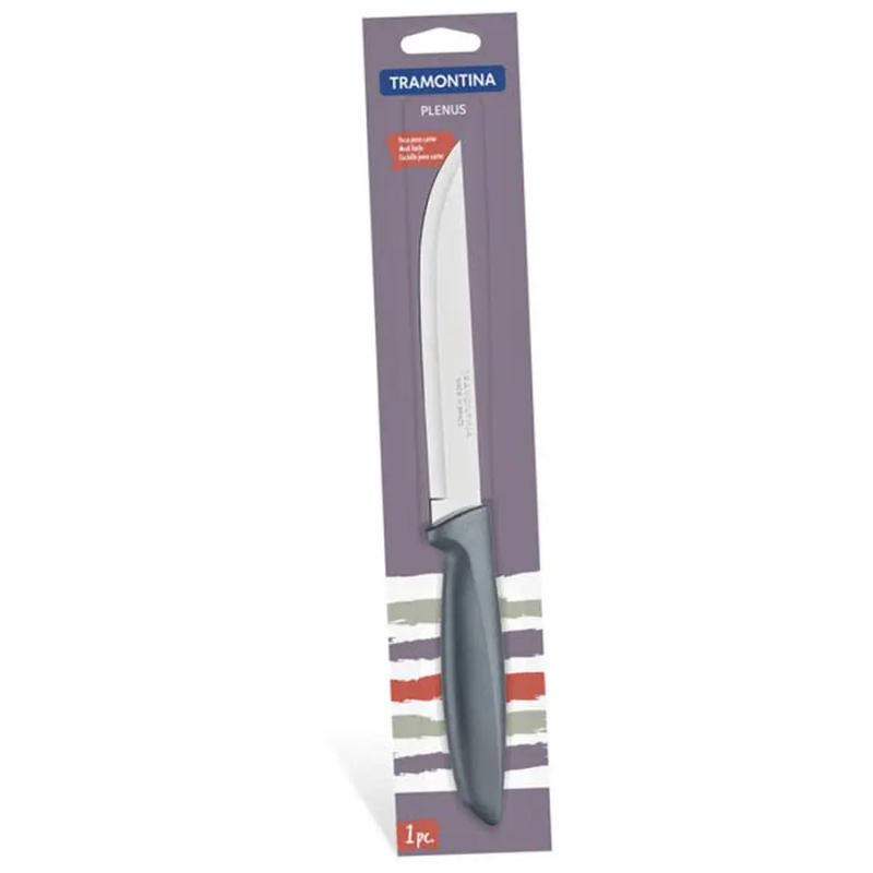 Универсальность для нарезки различных продуктов; Удобная пластиковая ручка для безопасного хвата; Прочное металлическое лезвие длиной 15 см; Компактный размер 28 см для легкости использования; Стильный серый цвет; Производство бренда Tramontina в Бразилии.